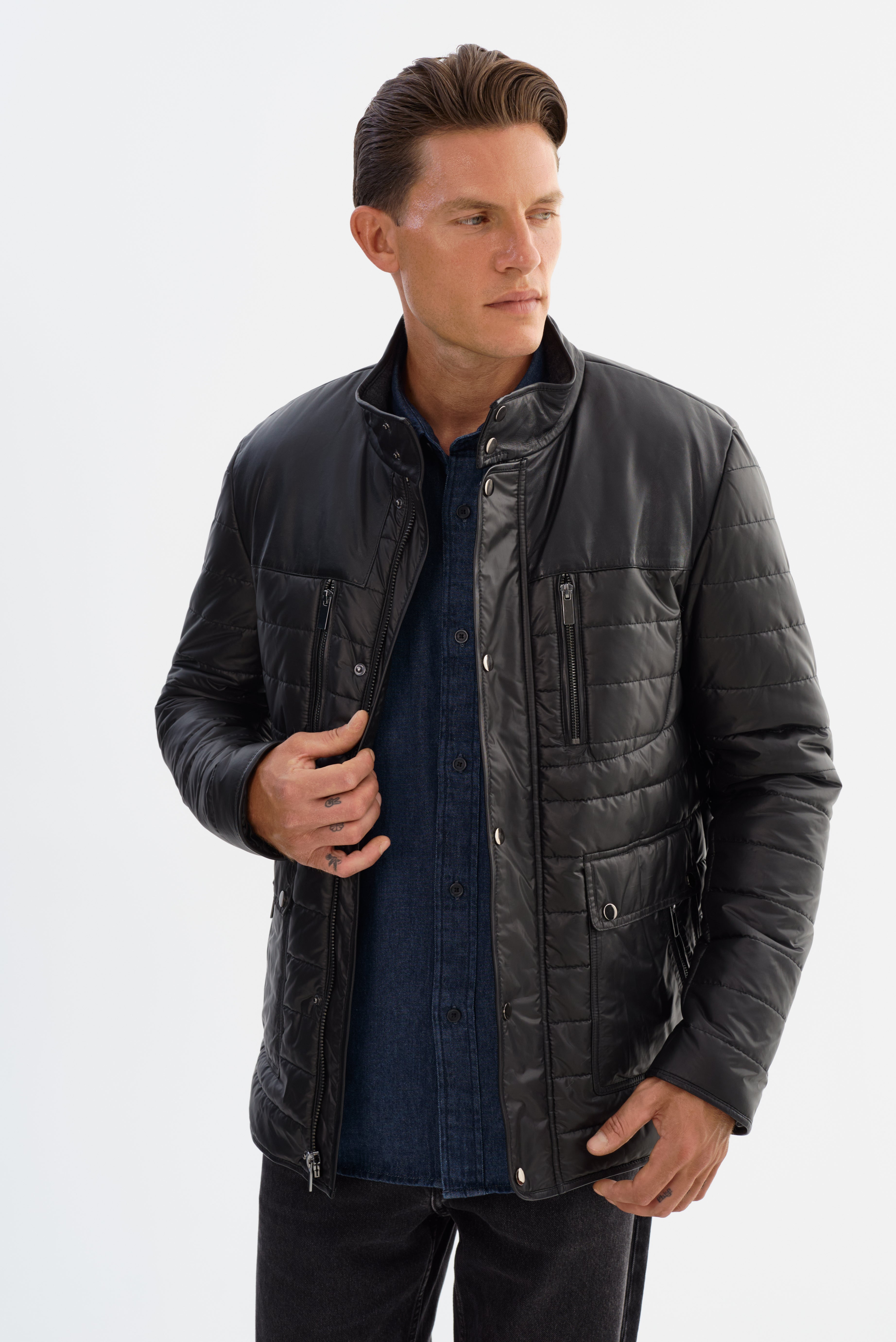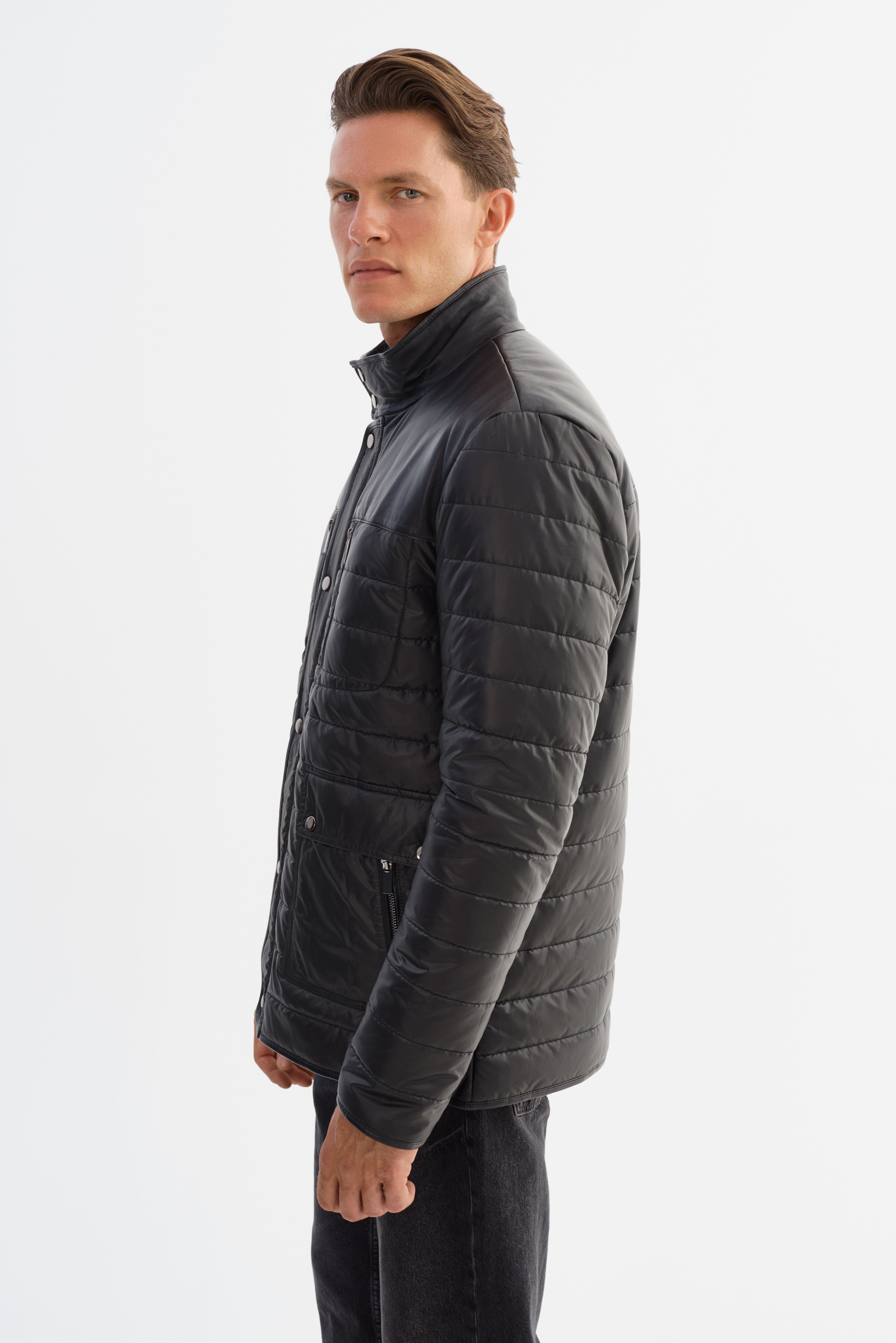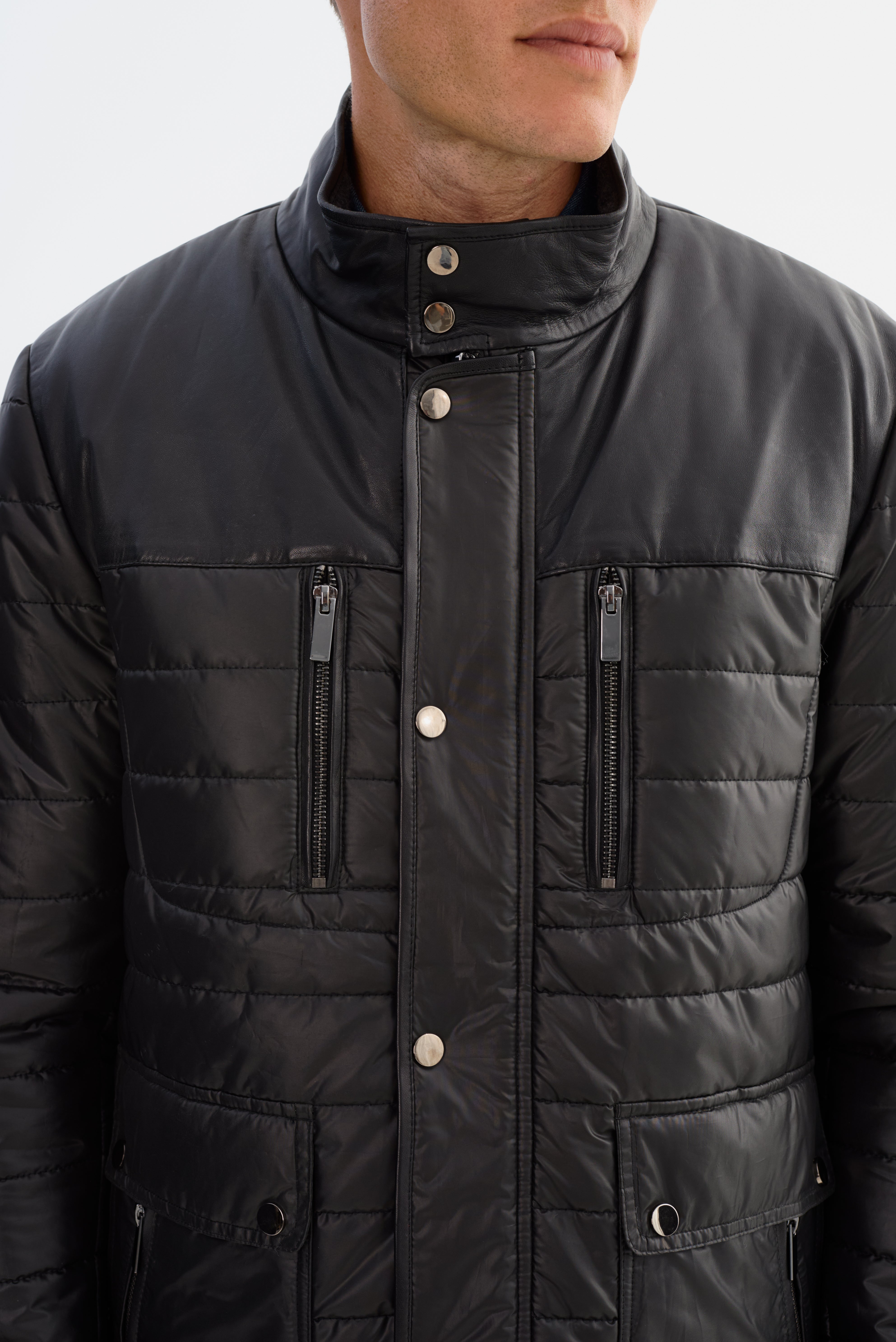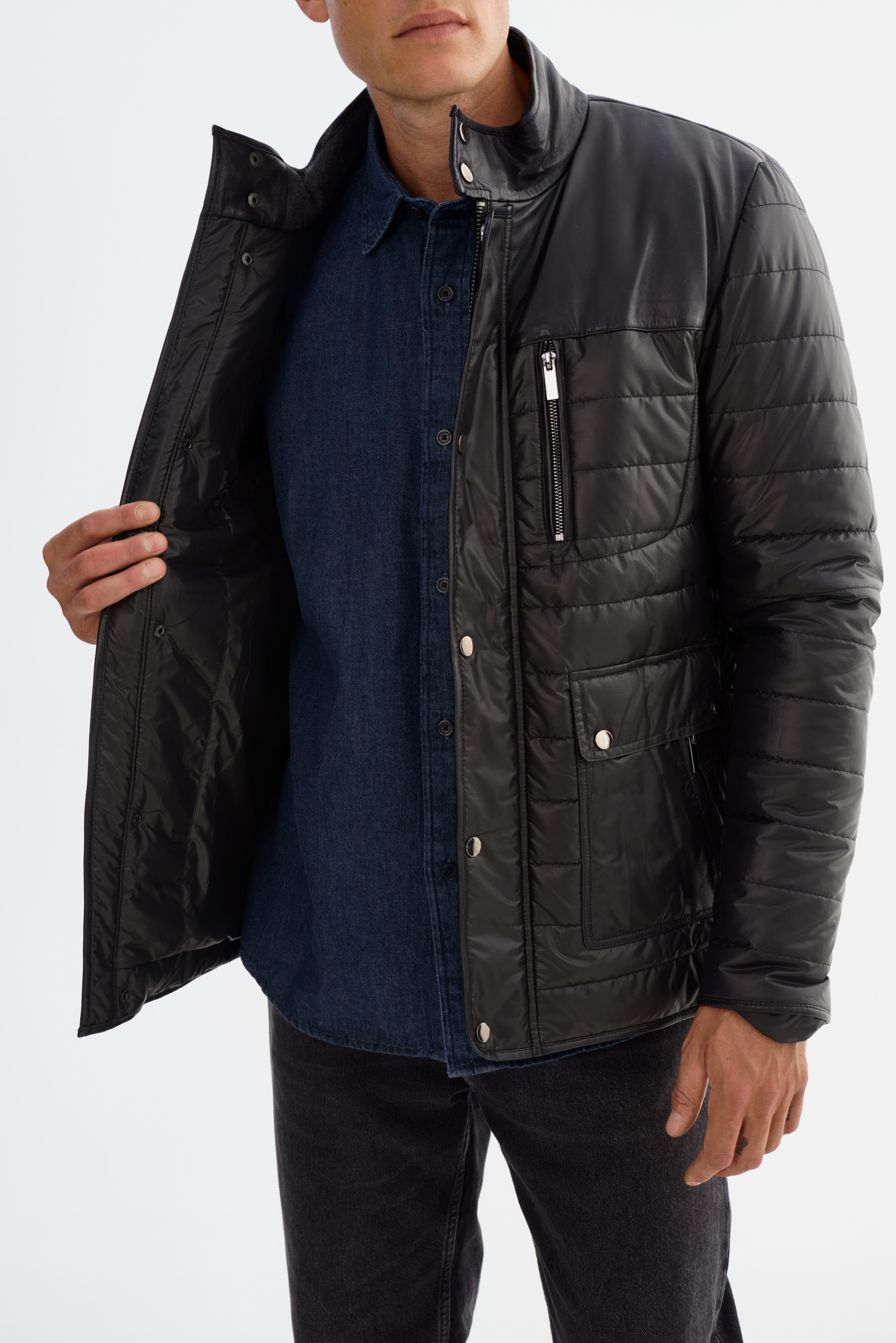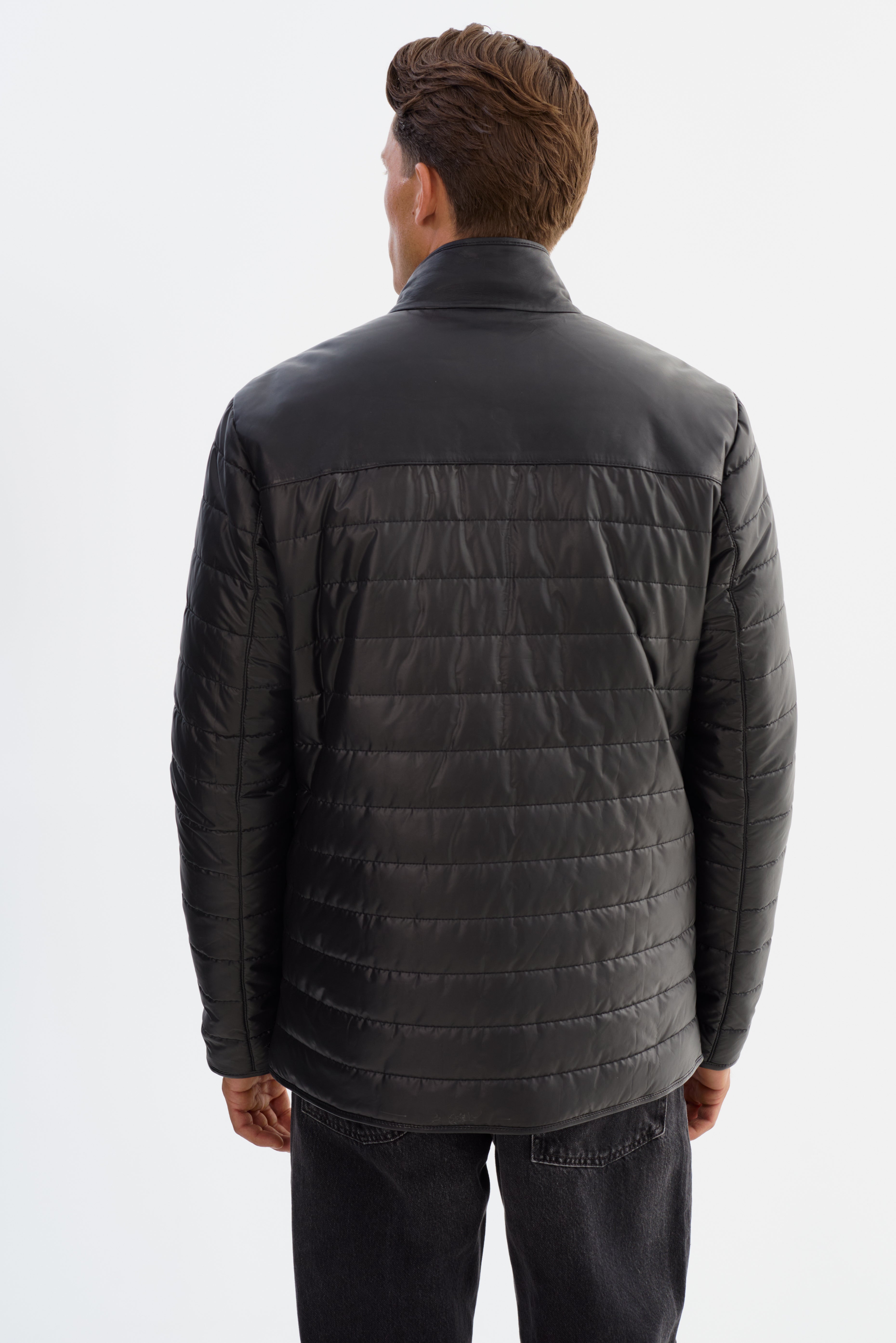 • Nylon puffer jacket with leather shoulders