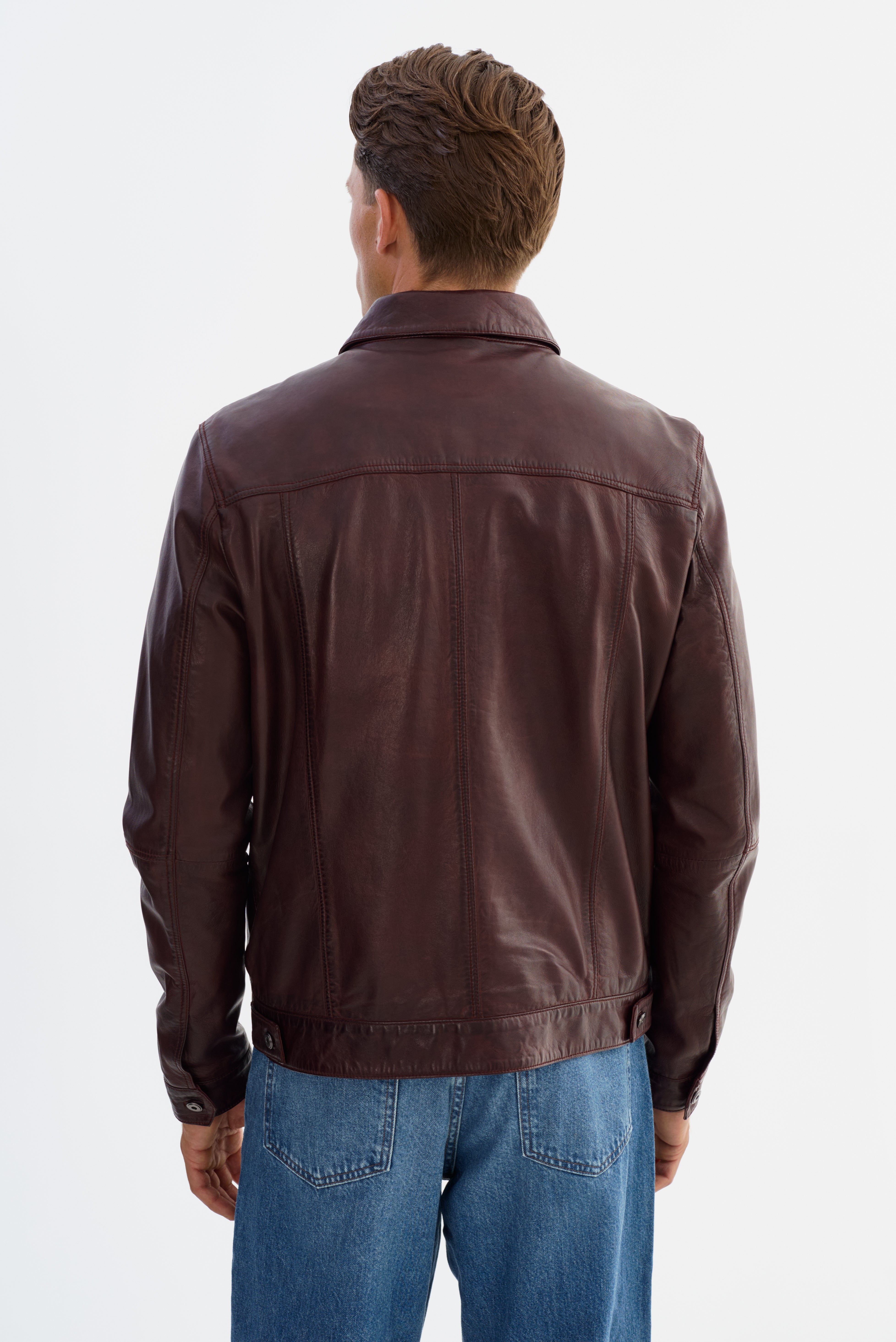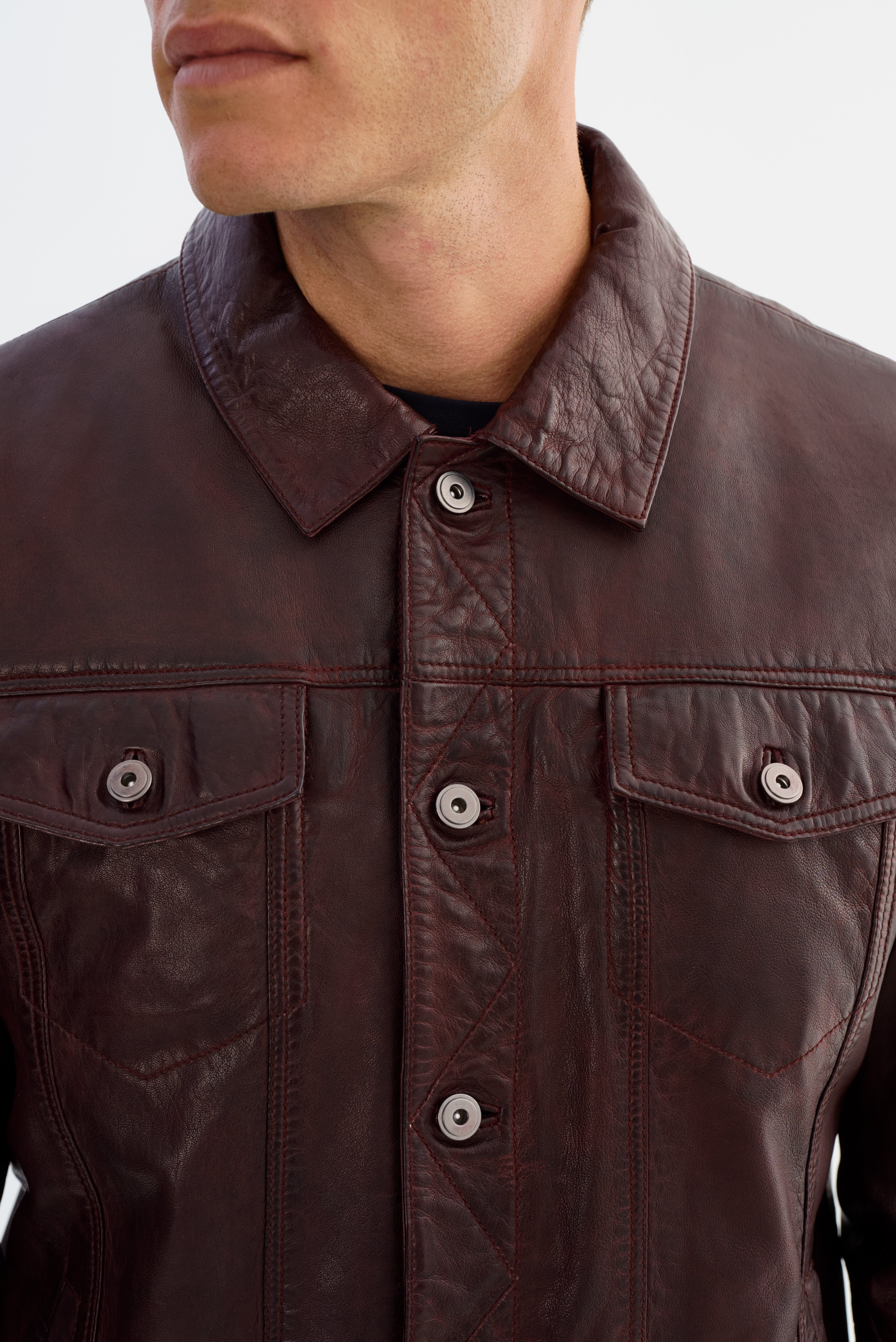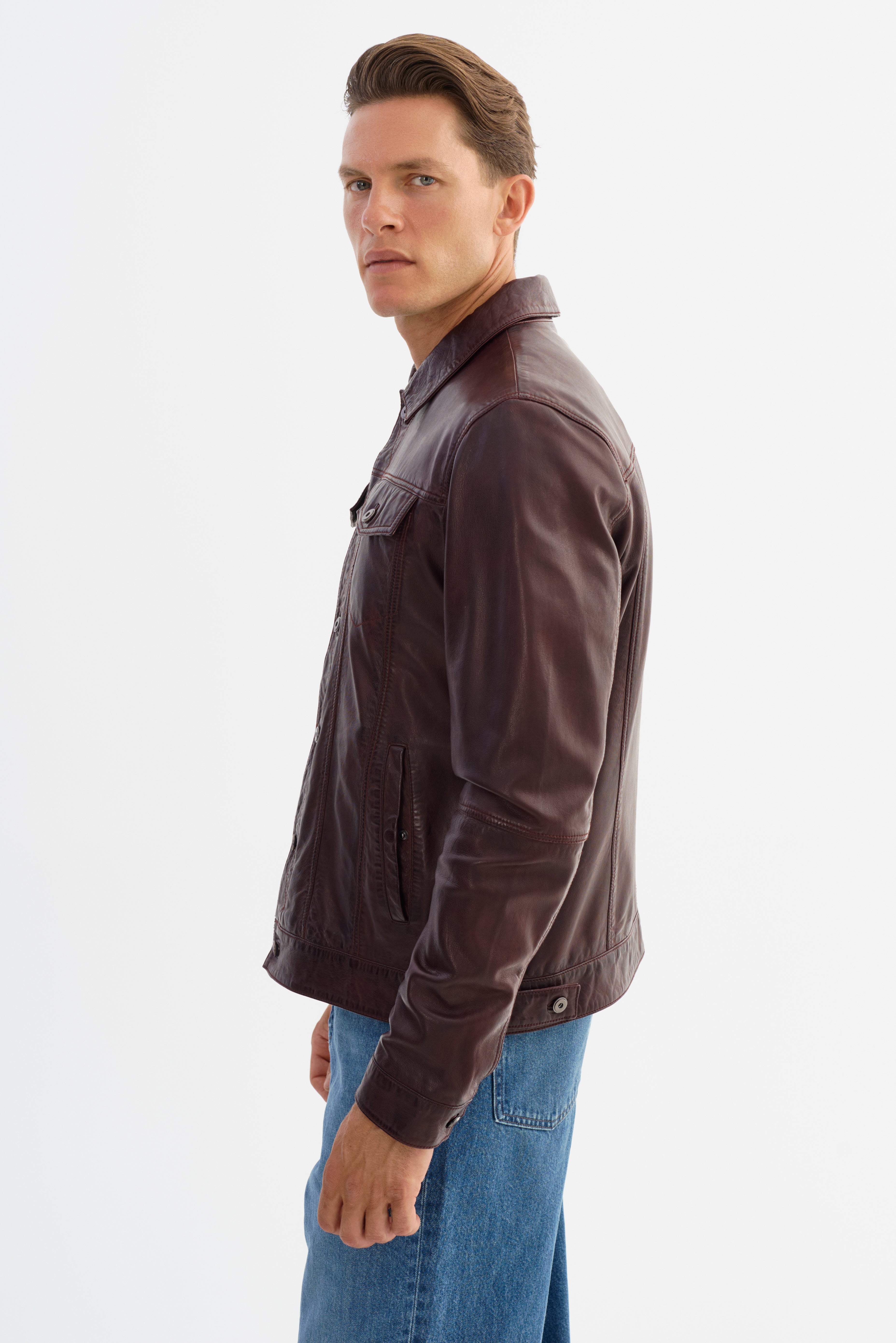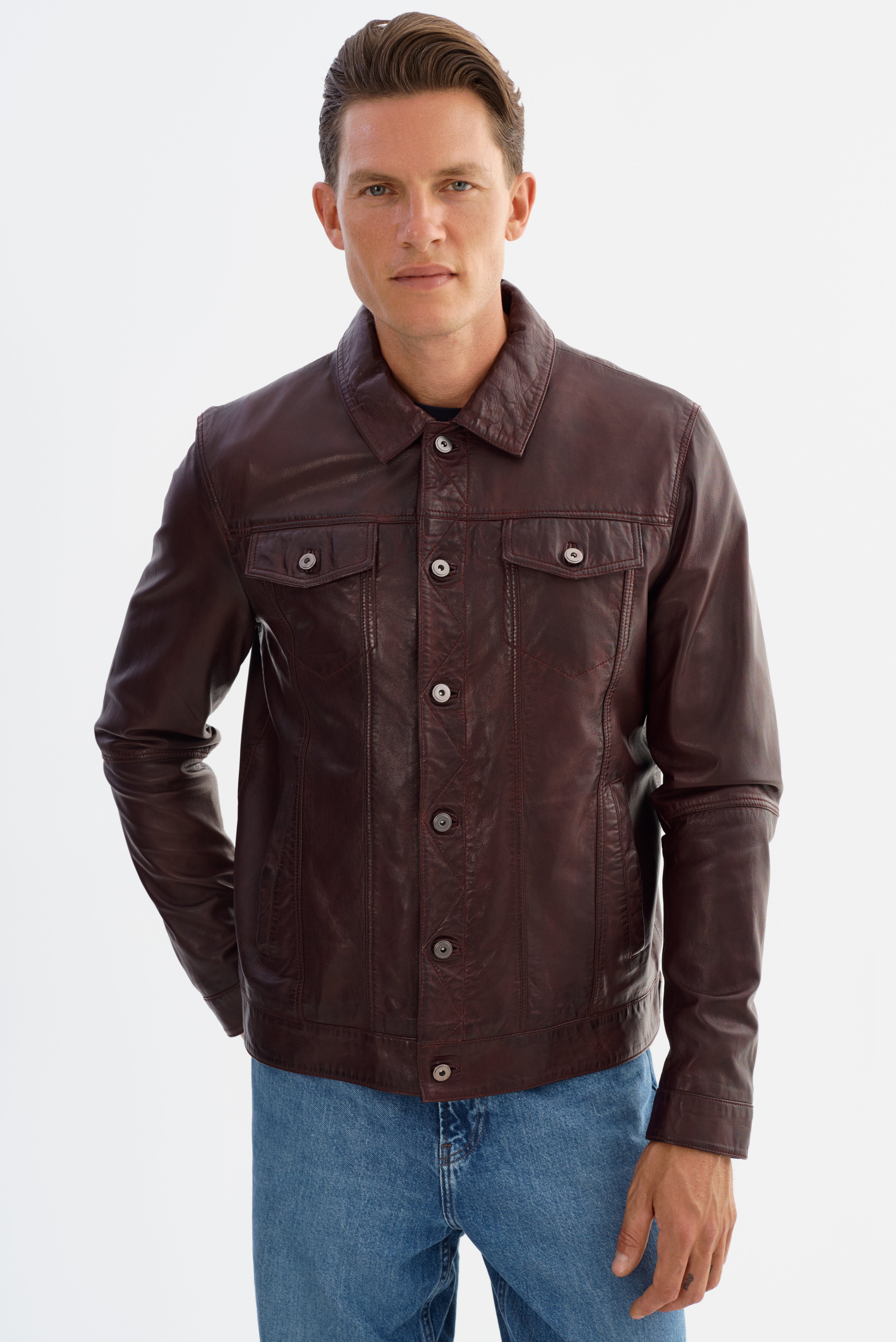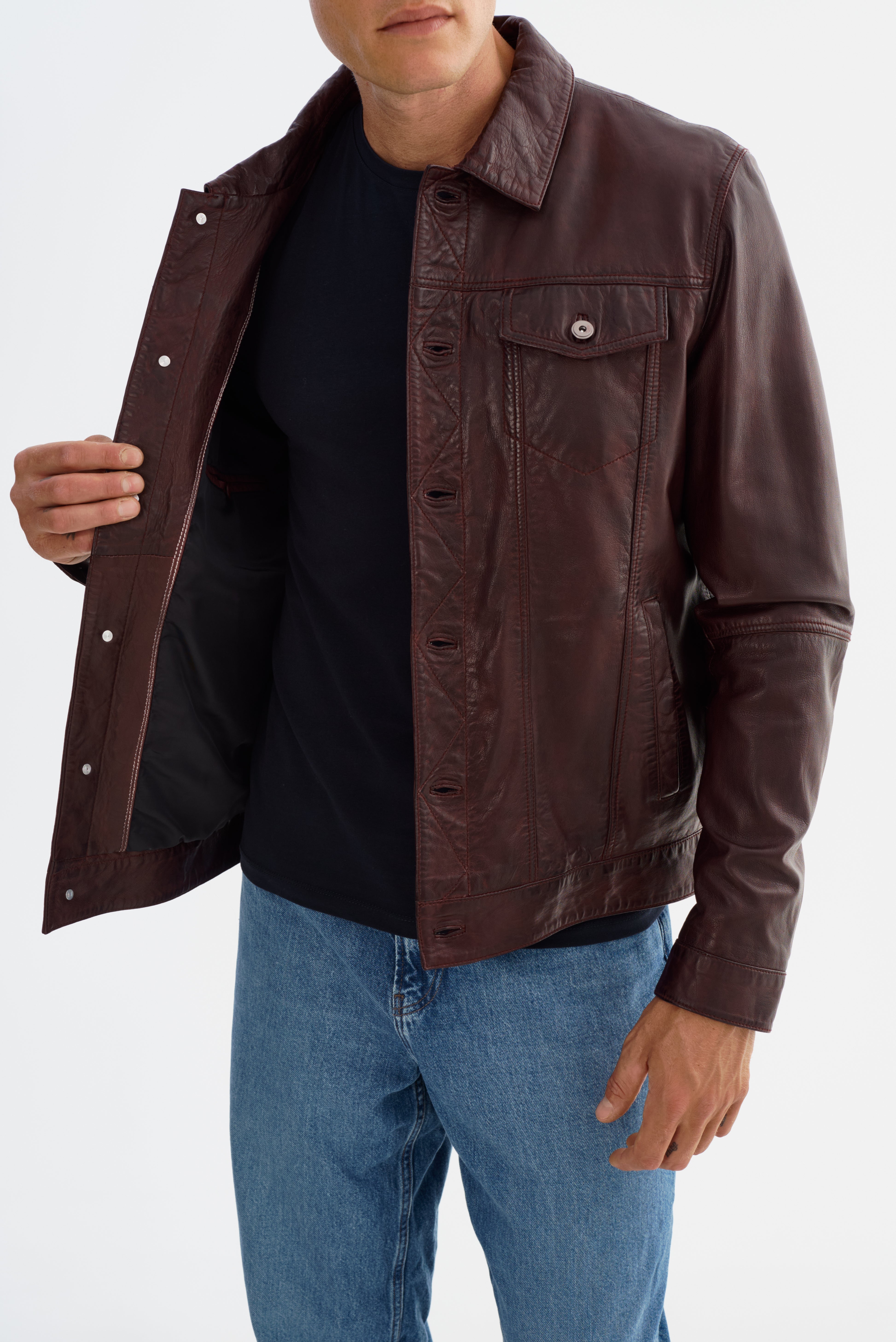 The MAVRICK Leather Jean Jacket brings a rugged classic into sharp, modern focus. Crafted from smooth, durable leather, it features the iconic jean jacket silhouette—complete with a structured collar, snap-button front, and chest pockets—for a look that's both timeless and versatile. With clean lines and a confident fit, the MAVRICK is built to elevate everyday wear, adding effortless edge to everything from casual denim to tailored layers.