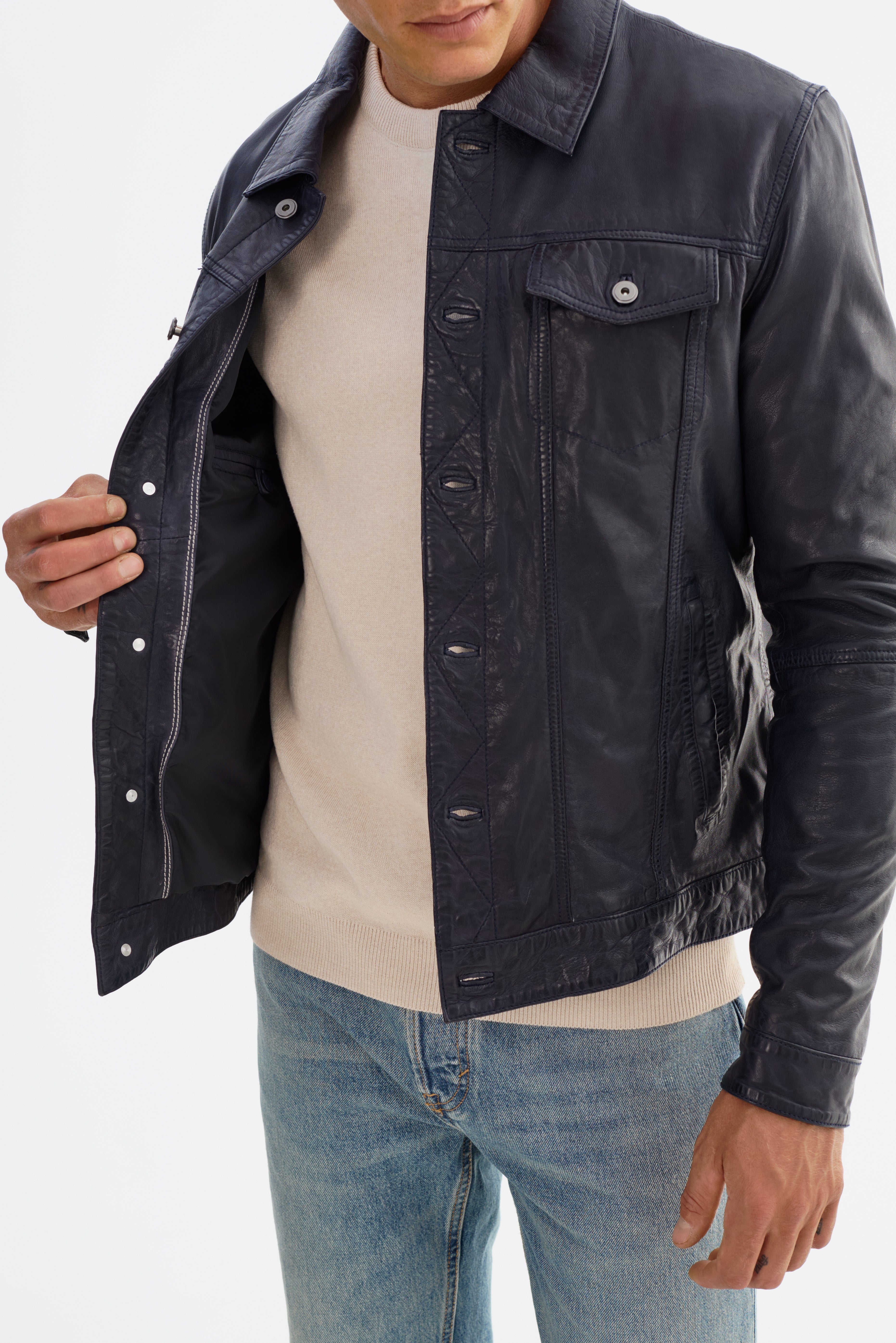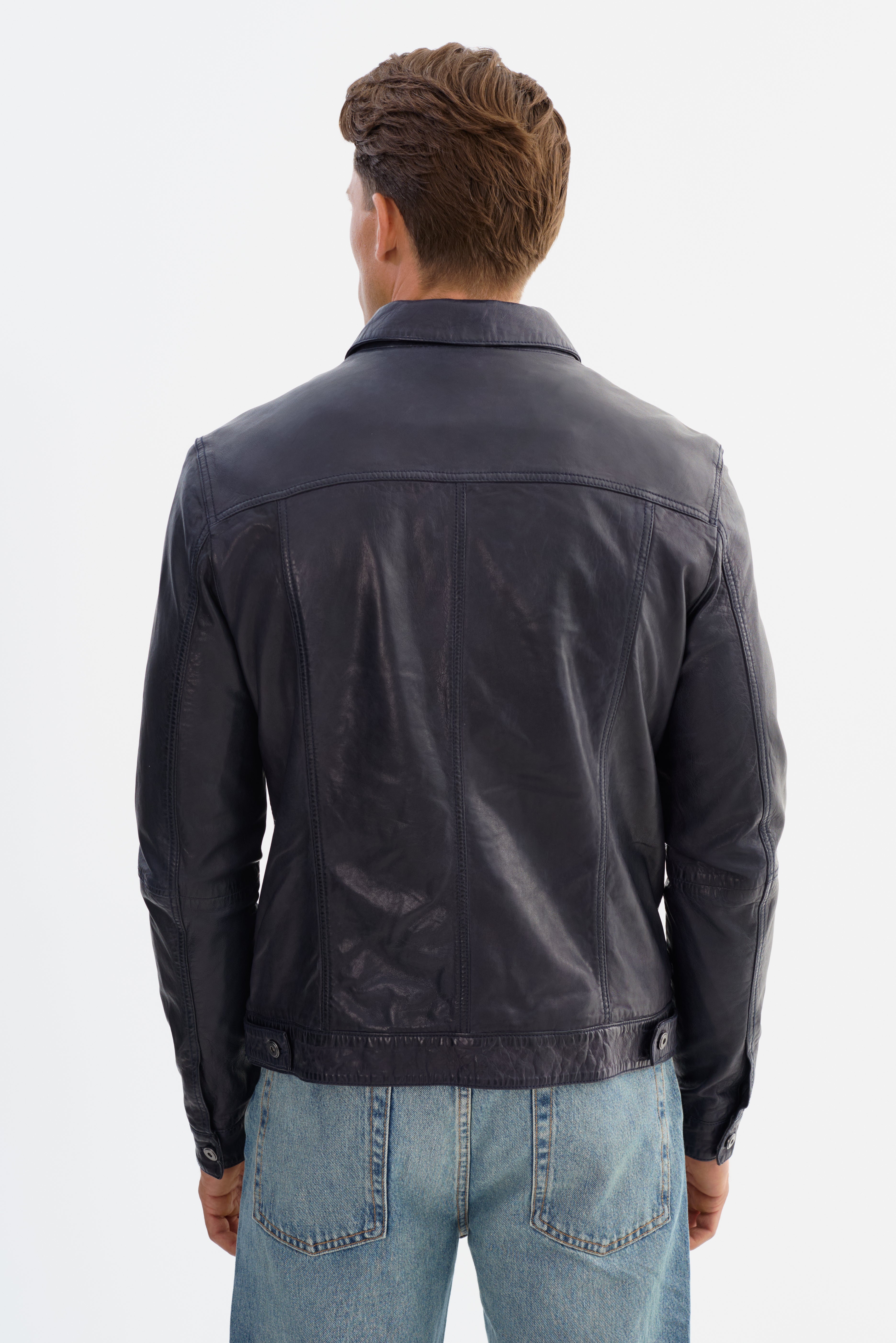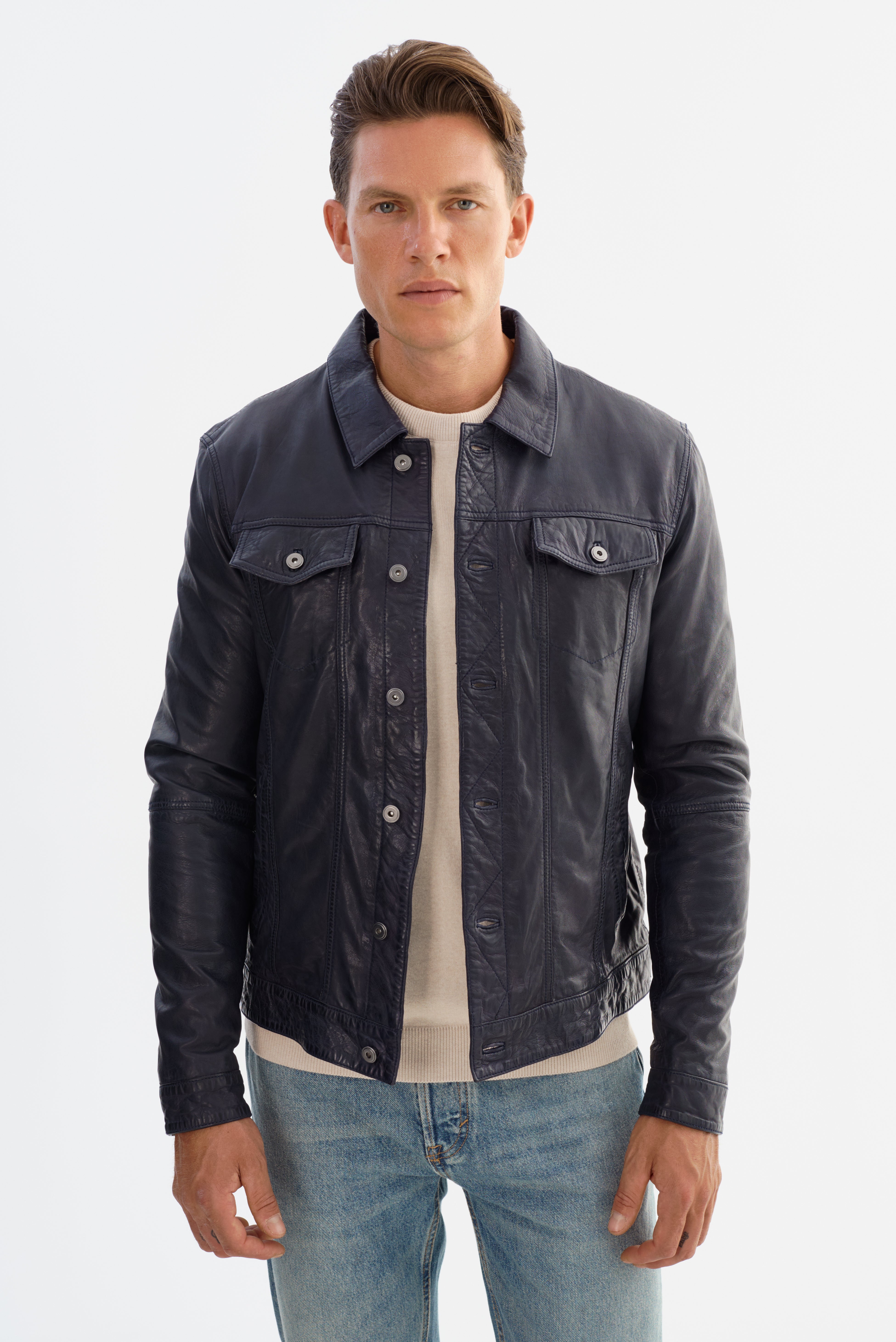 The MAVRICK Leather Jean Jacket brings a rugged classic into sharp, modern focus. Crafted from smooth, durable leather, it features the iconic jean jacket silhouette—complete with a structured collar, snap-button front, and chest pockets—for a look that's both timeless and versatile. With clean lines and a confident fit, the MAVRICK is built to elevate everyday wear, adding effortless edge to everything from casual denim to tailored layers.