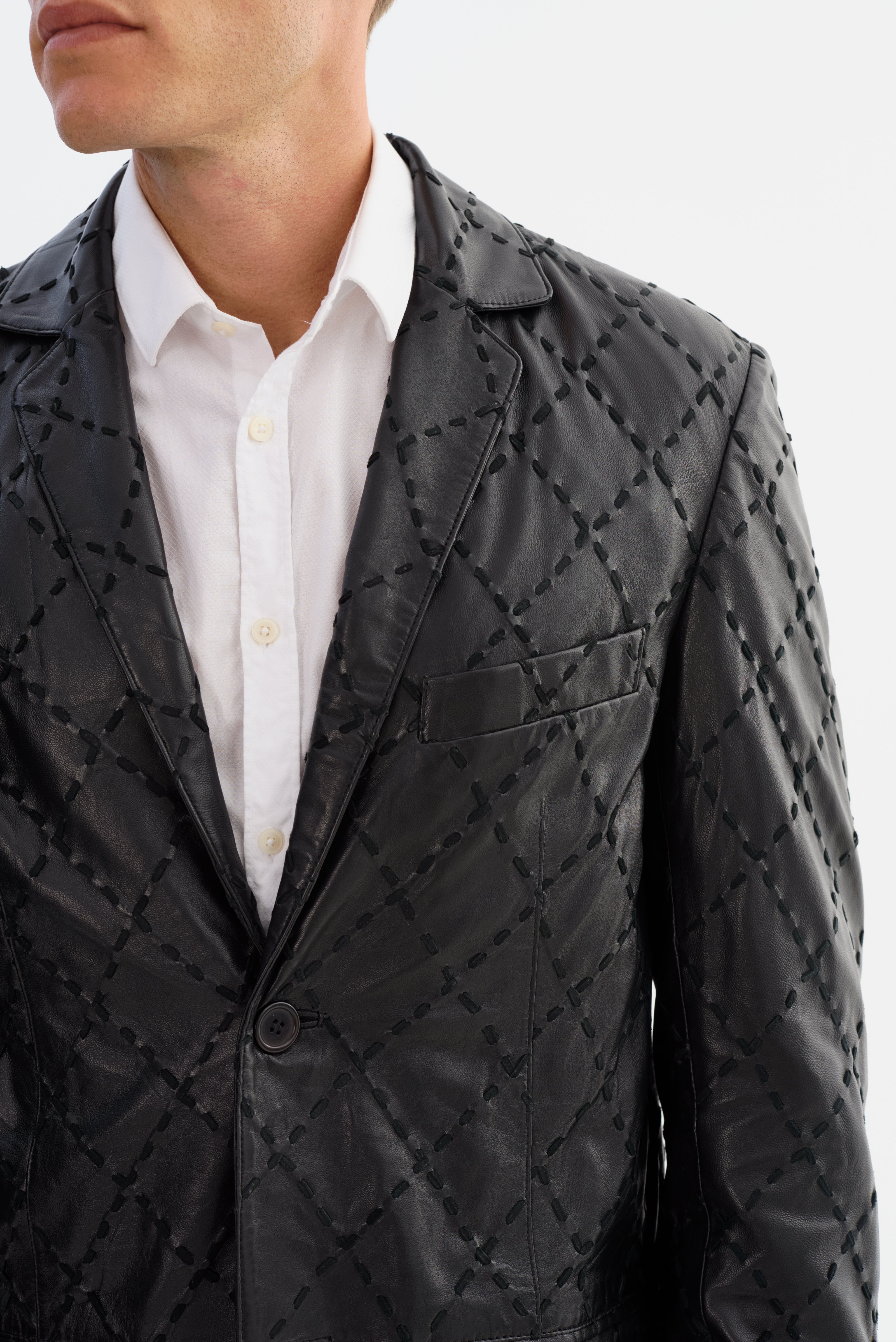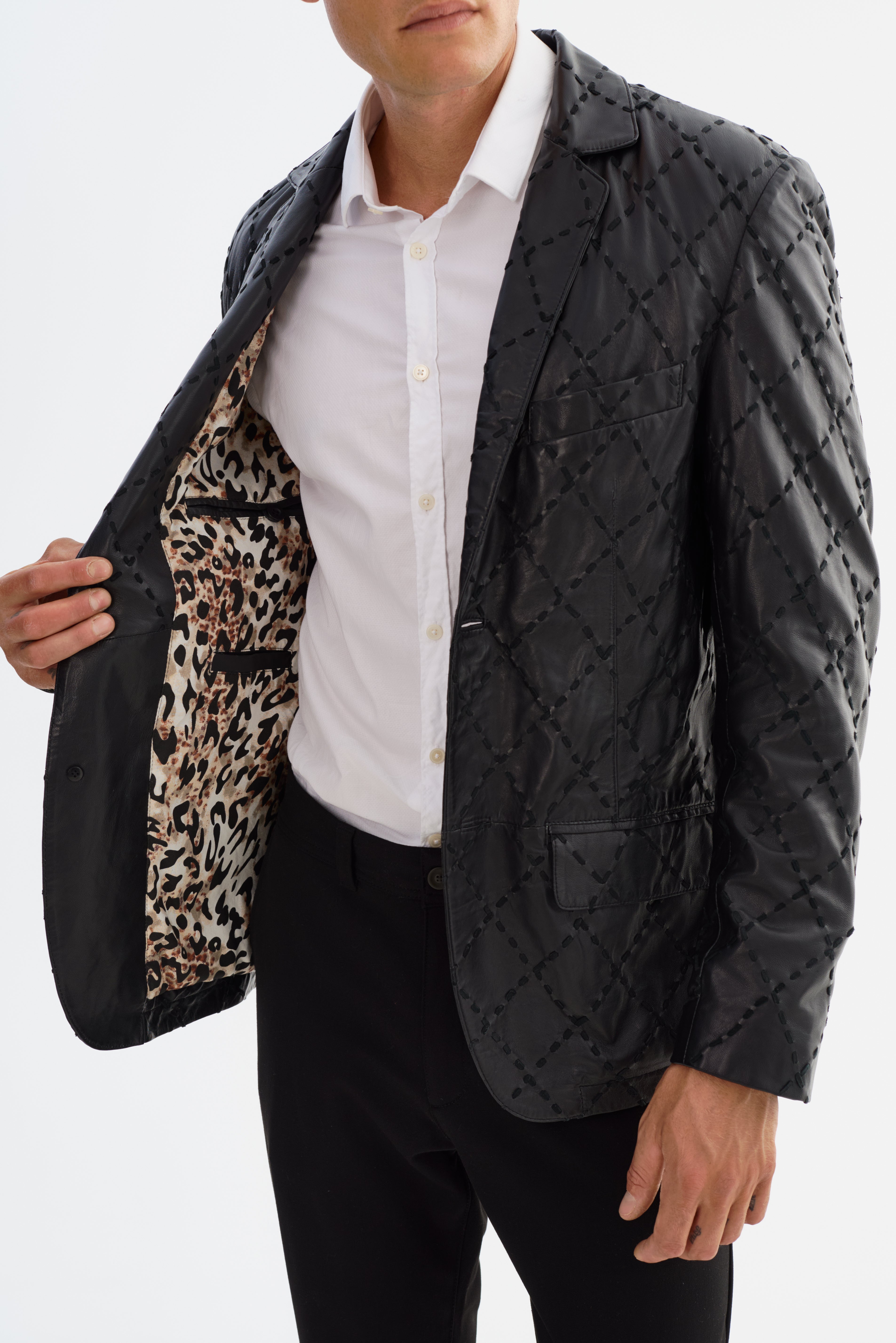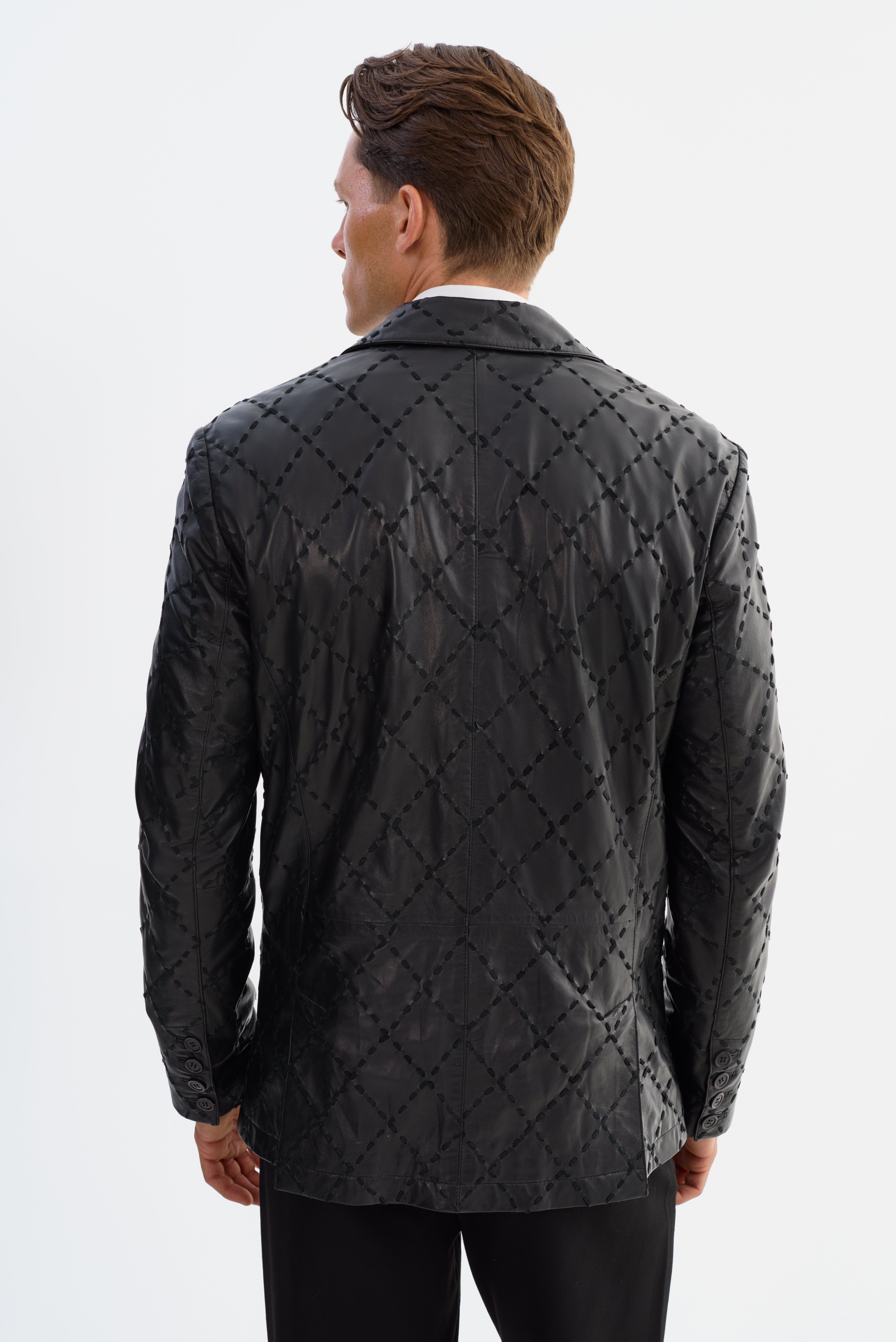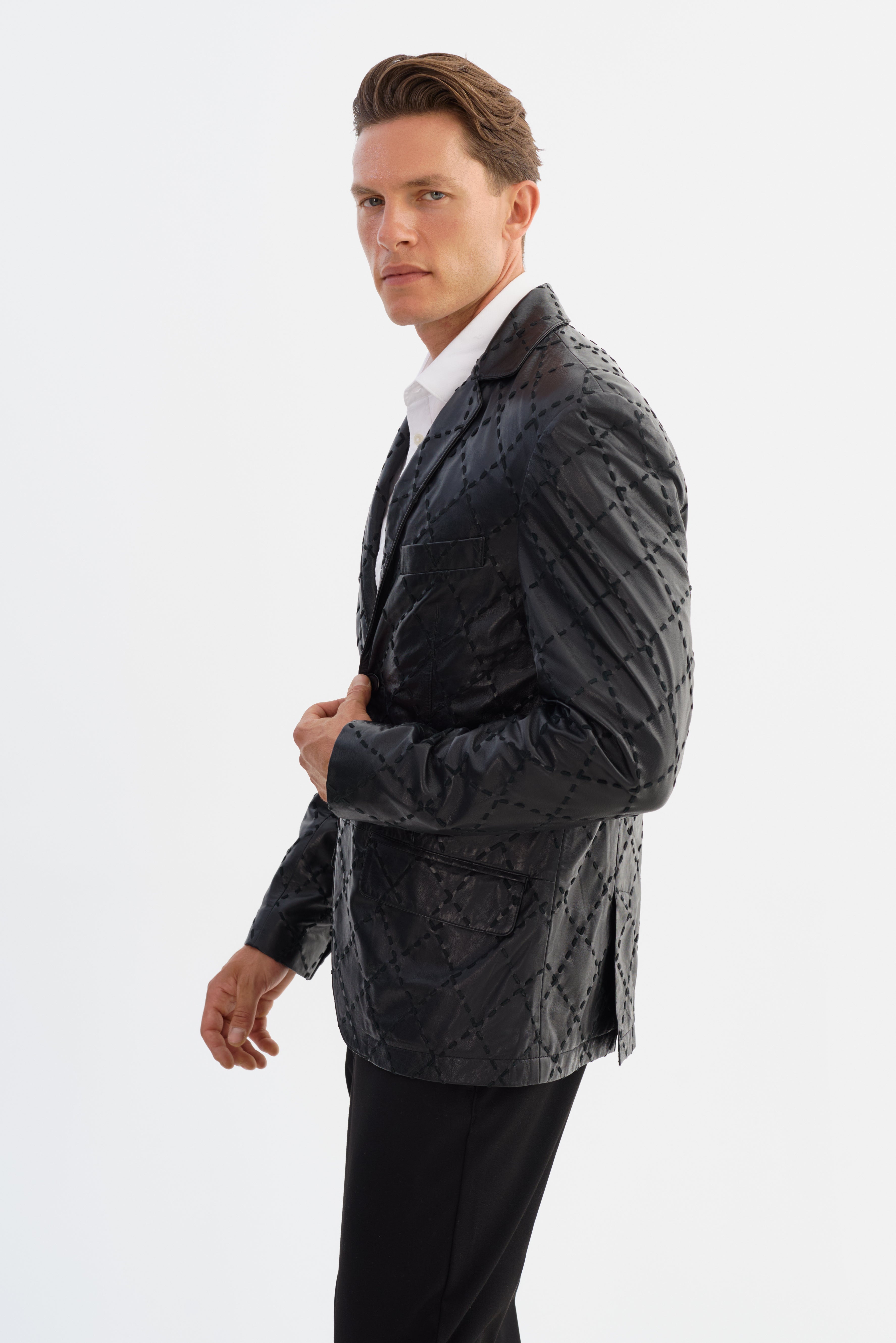 The MILES Quilted Leather Blazer is a bold statement piece that redefines classic tailoring with a modern edge. Featuring an intricate quilted design and a sleek notch collar, this blazer blends sophistication with contemporary style. A single-breasted front closure and double flap pockets add to its refined structure, while the striking interior lining offers an unexpected touch of personality. Whether worn for a night out or as a standout piece in your wardrobe, the MILES blazer is designed to turn heads.