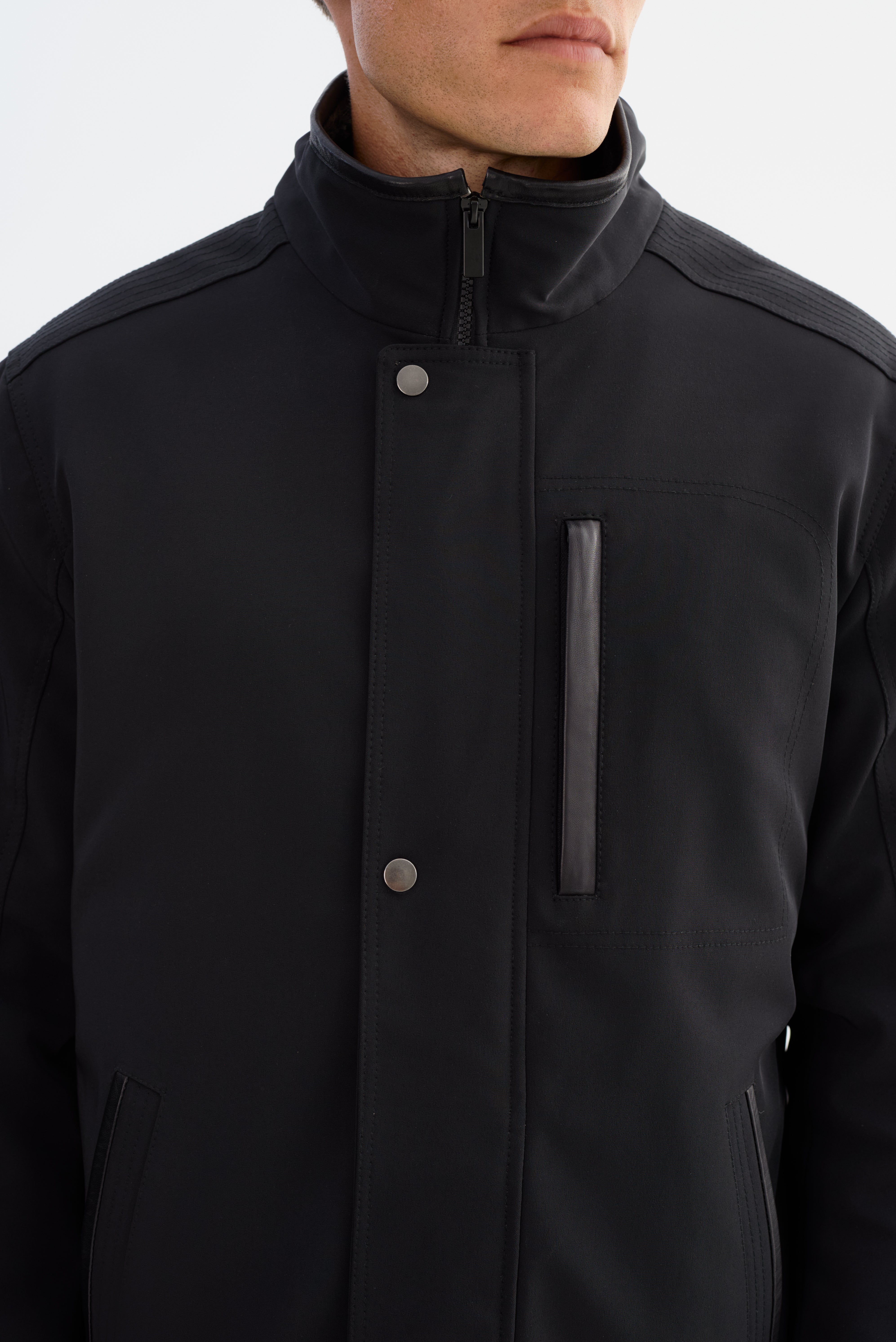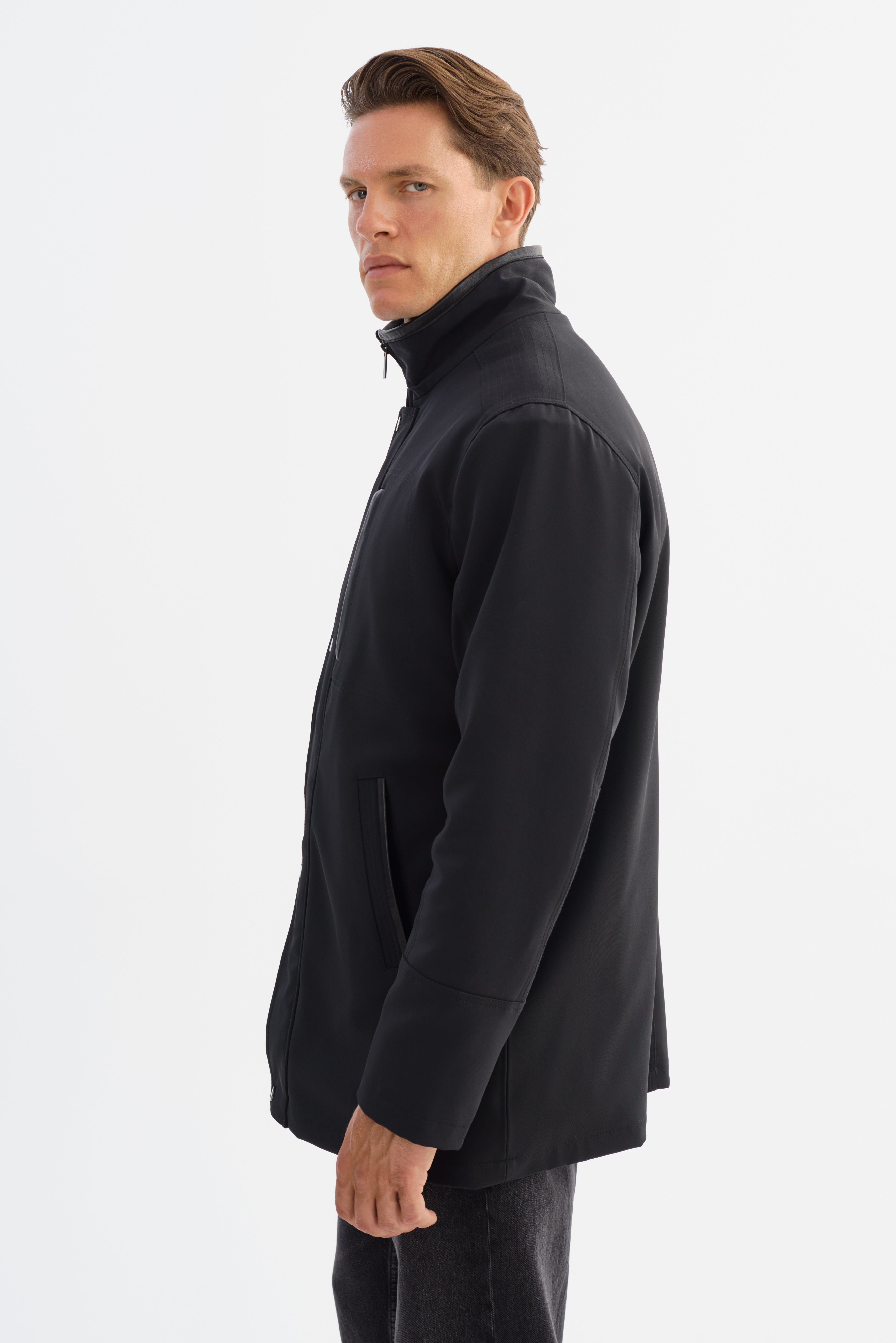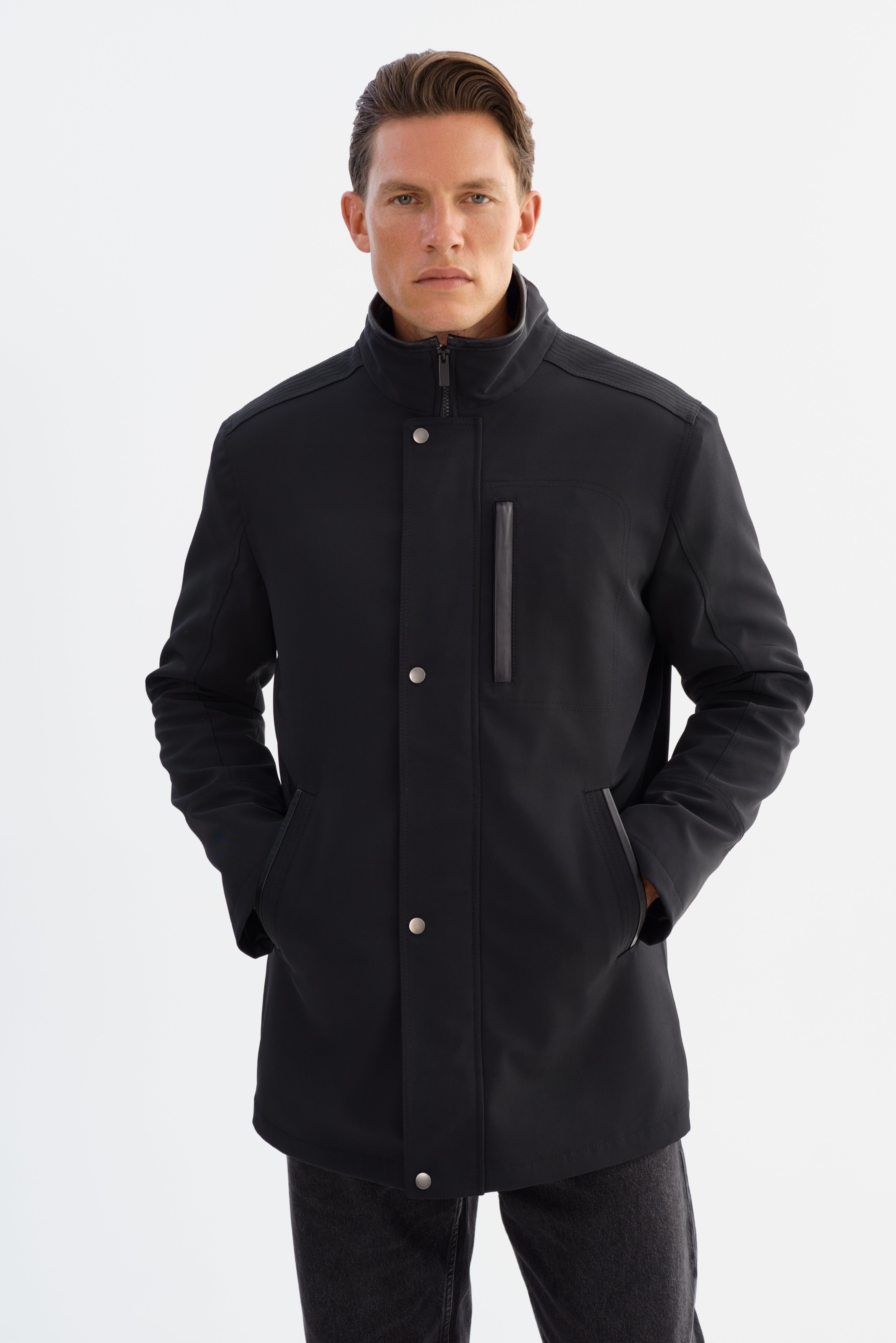 The PRADO Jacket combines sharp tailoring with subtle leather detailing for a look that's both polished and practical. Designed in a three-quarter length silhouette, it features refined leather trim that adds depth and contrast to its streamlined structure. A clean front closure and modern collar elevate the overall design, while the durable construction ensures it's built to last. Whether layered over casual staples or smart essentials, the PRADO delivers understated sophistication with everyday wearability.