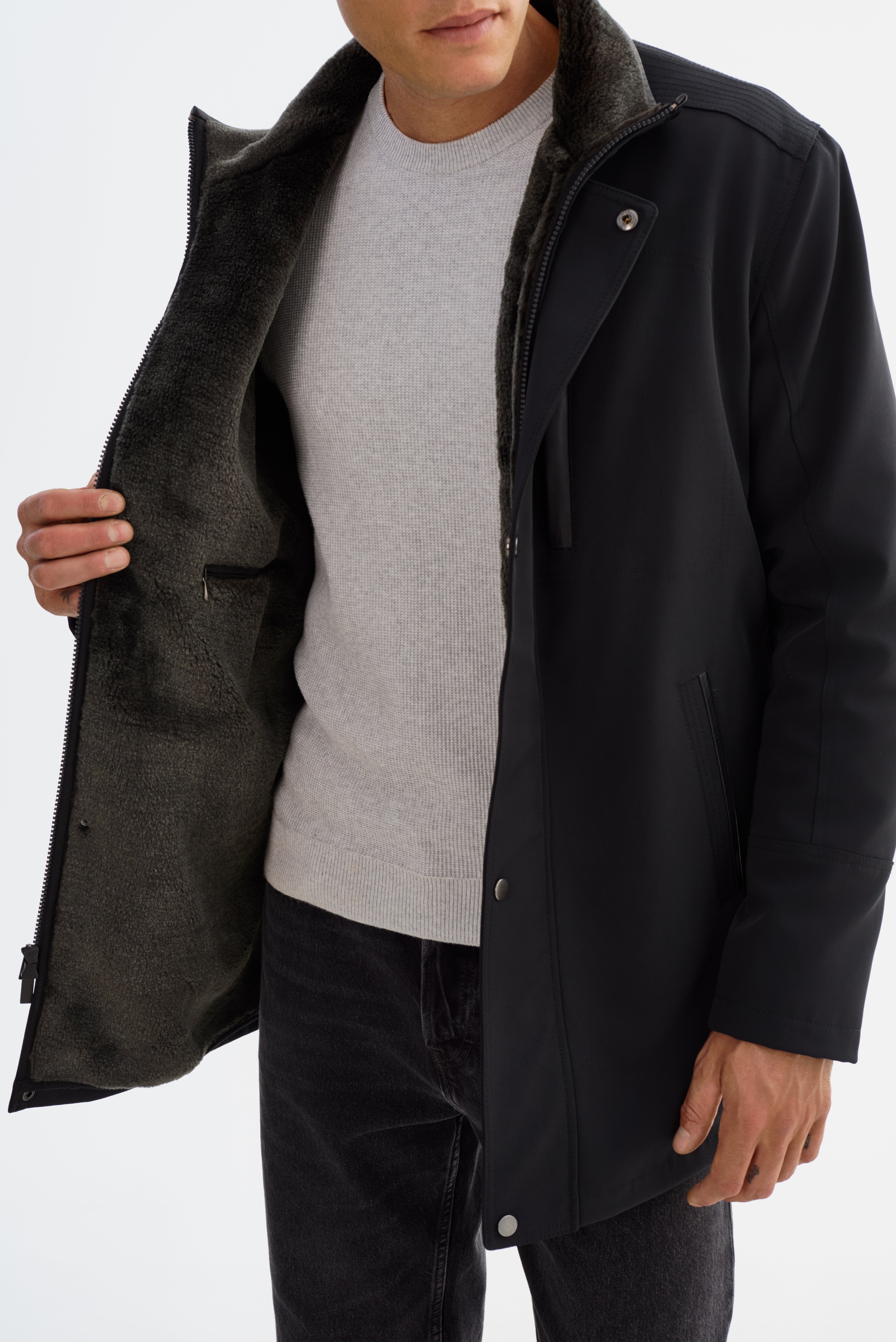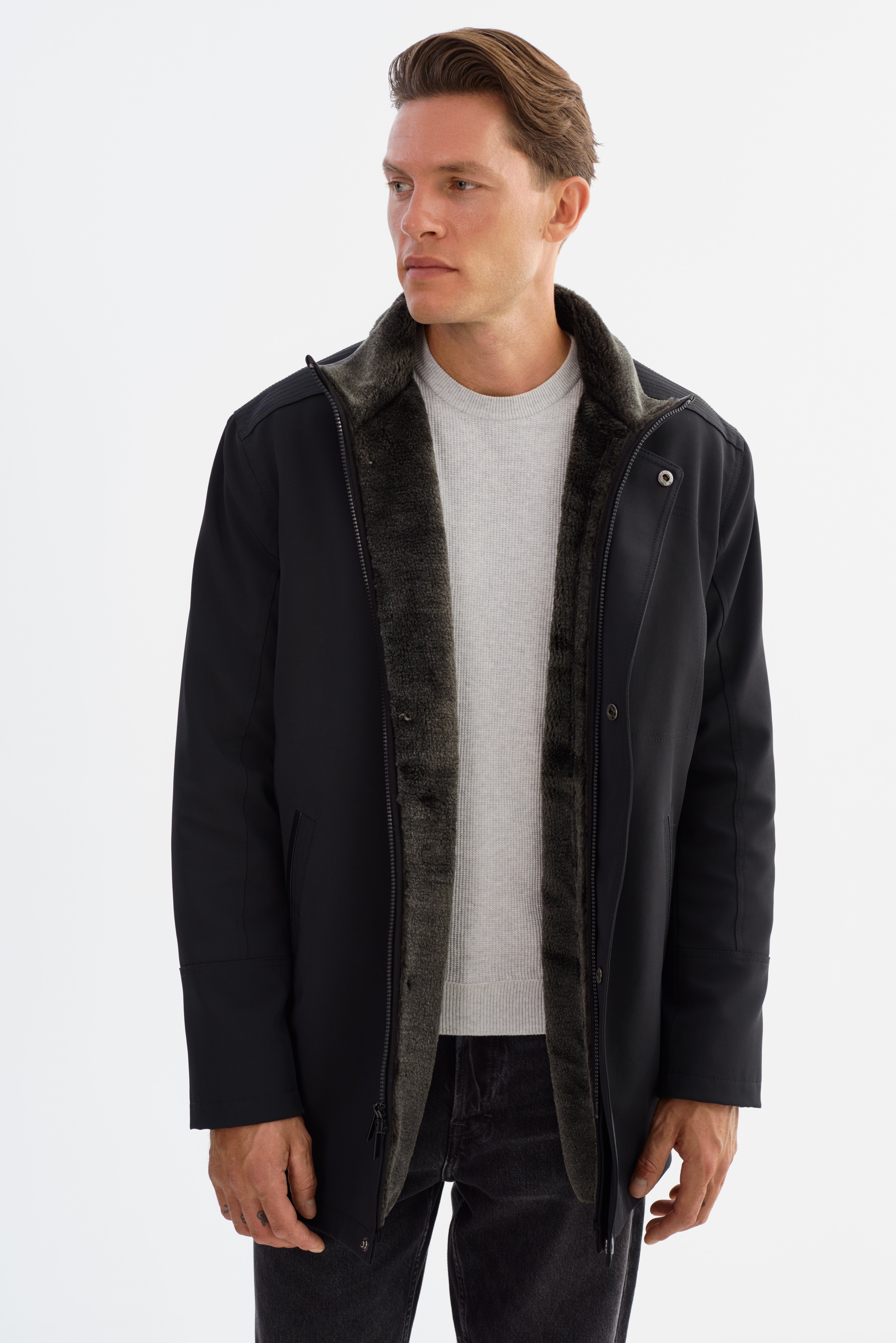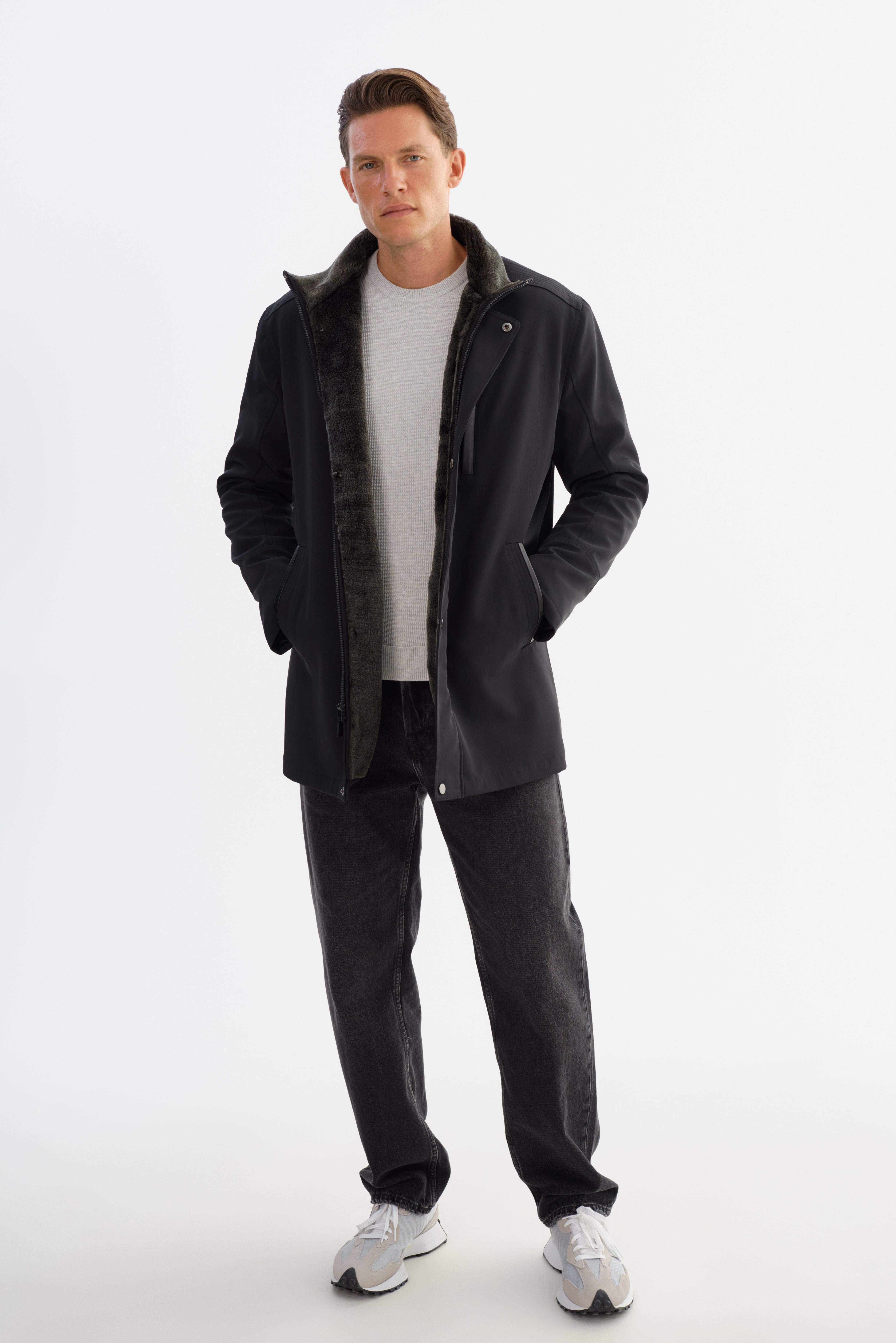 The PRADO Jacket combines sharp tailoring with subtle leather detailing for a look that's both polished and practical. Designed in a three-quarter length silhouette, it features refined leather trim that adds depth and contrast to its streamlined structure. A clean front closure and modern collar elevate the overall design, while the durable construction ensures it's built to last. Whether layered over casual staples or smart essentials, the PRADO delivers understated sophistication with everyday wearability.
