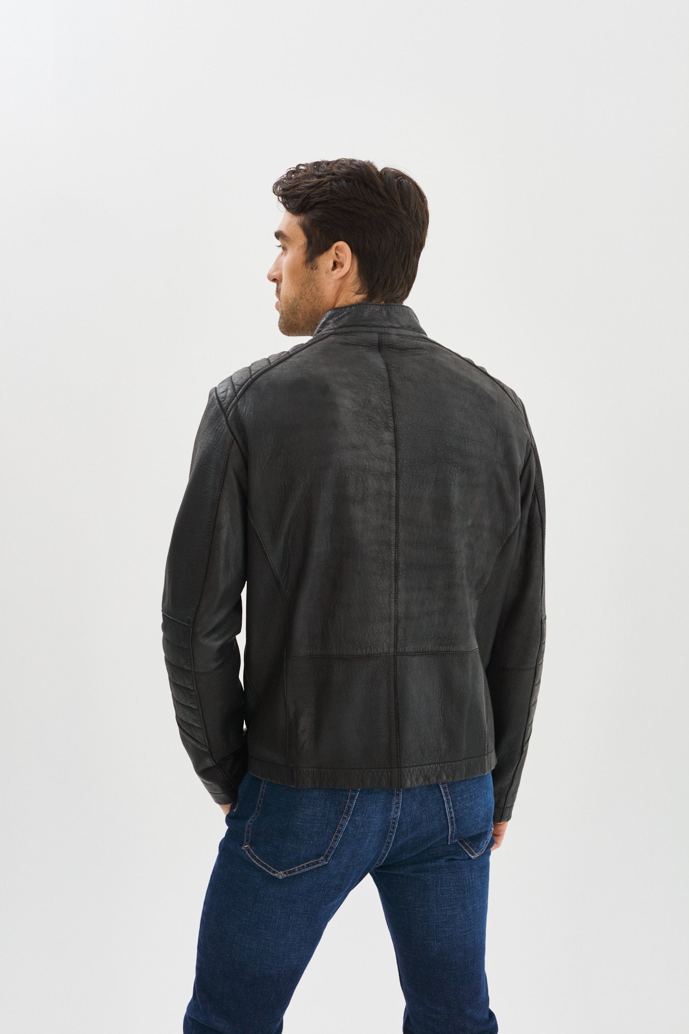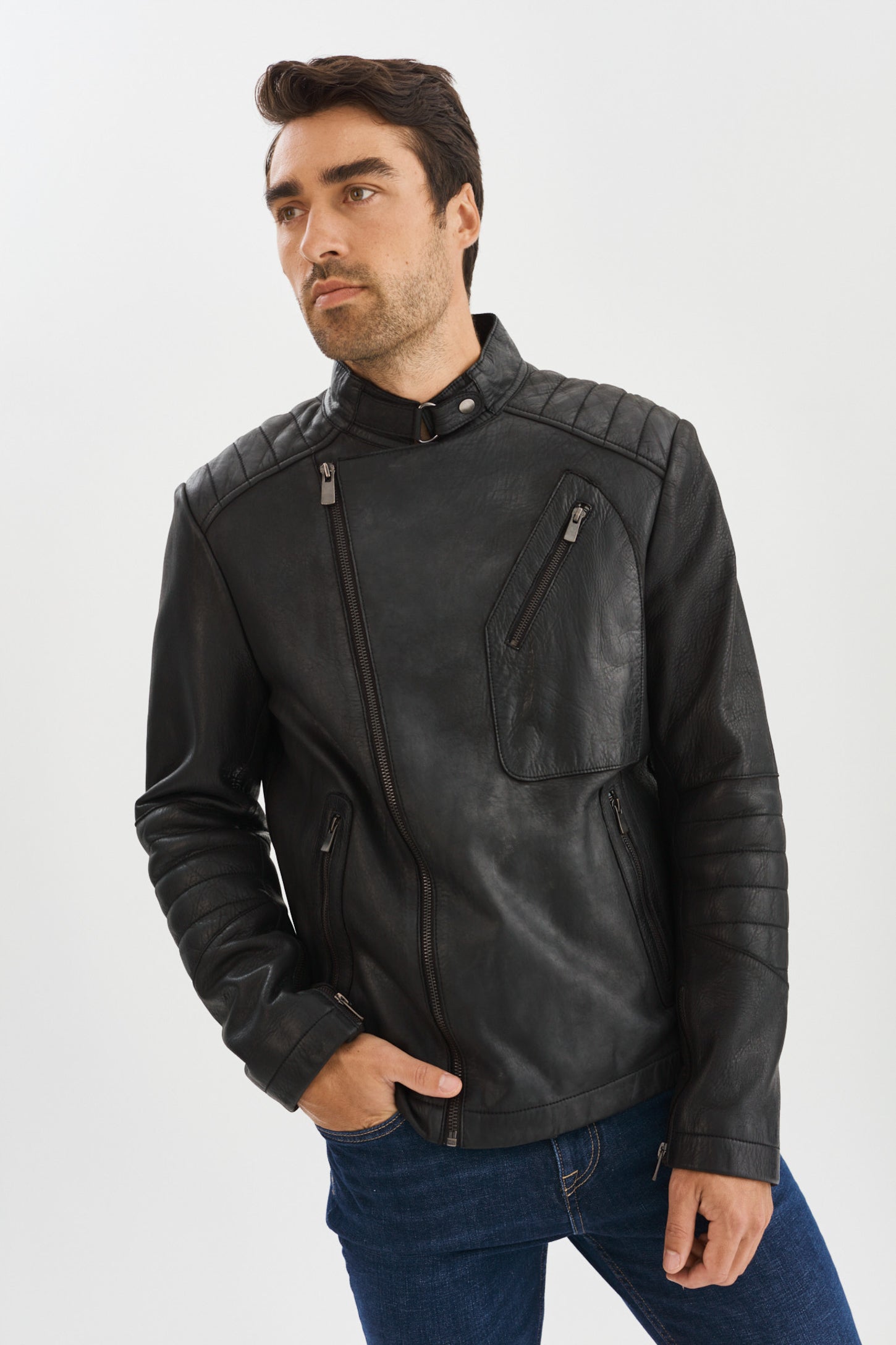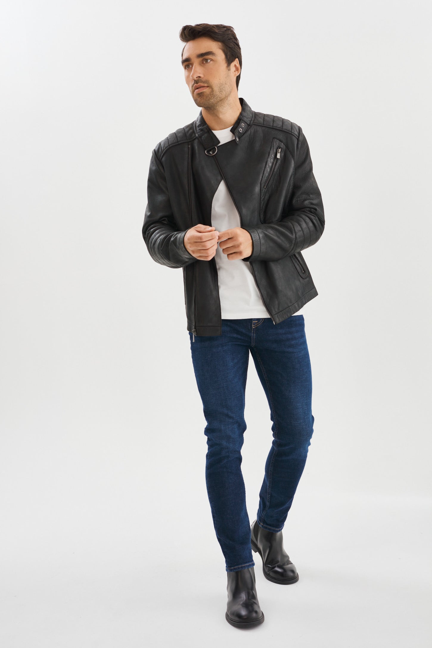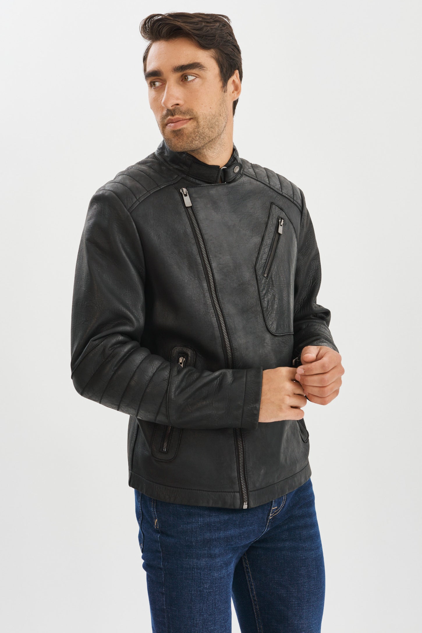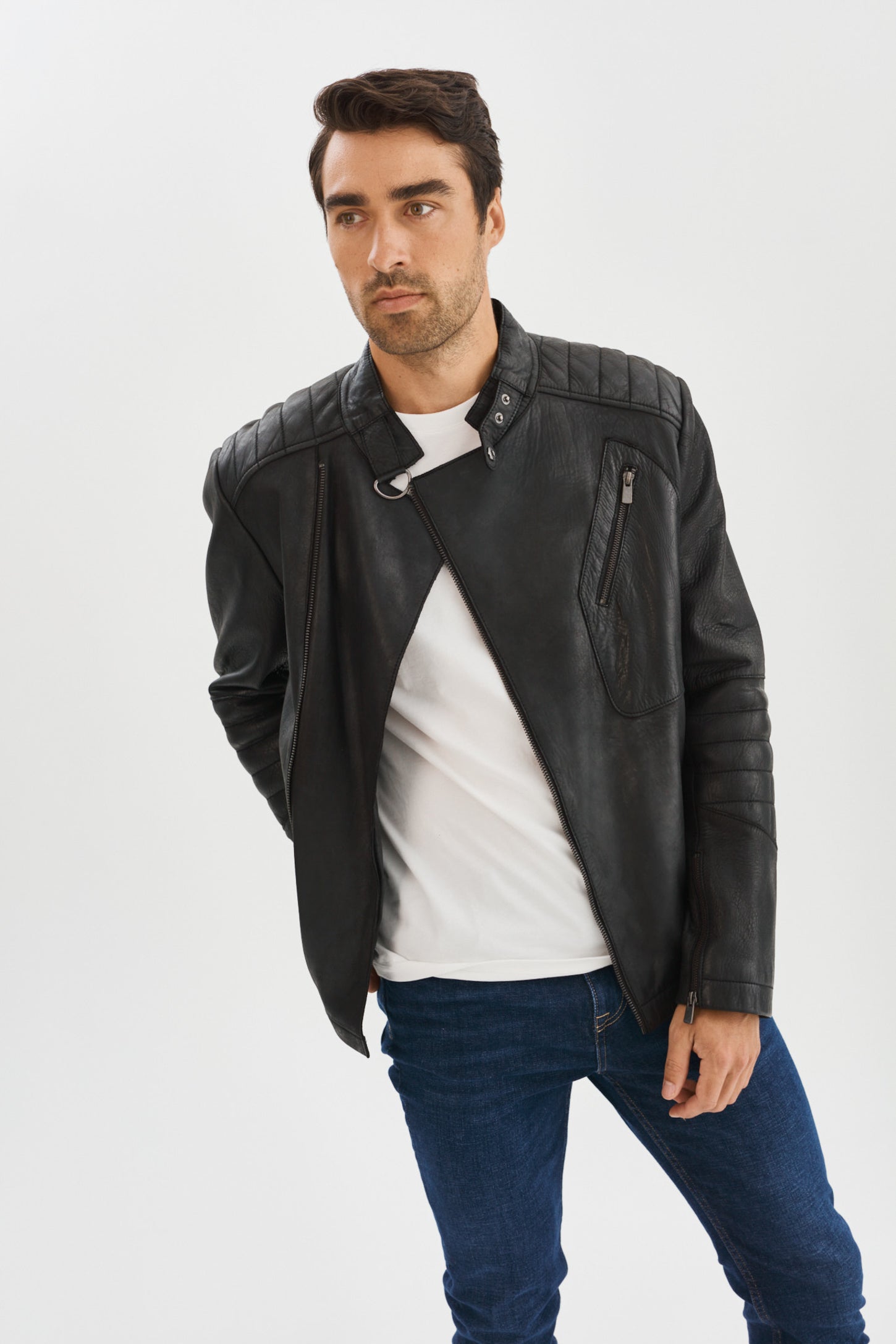 The THONOS Leather Jacket is built with a distinct edge and unmistakable presence. Inspired by classic moto styling, it features an asymmetrical zip front, quilted shoulder and sleeve detailing, and strategically placed zippered pockets that enhance both form and function. The snap-tab stand collar adds a touch of structure, while the textured leather finish brings character and depth. Designed for the modern man who moves with intention, the THONOS is where precision tailoring meets rugged confidence.